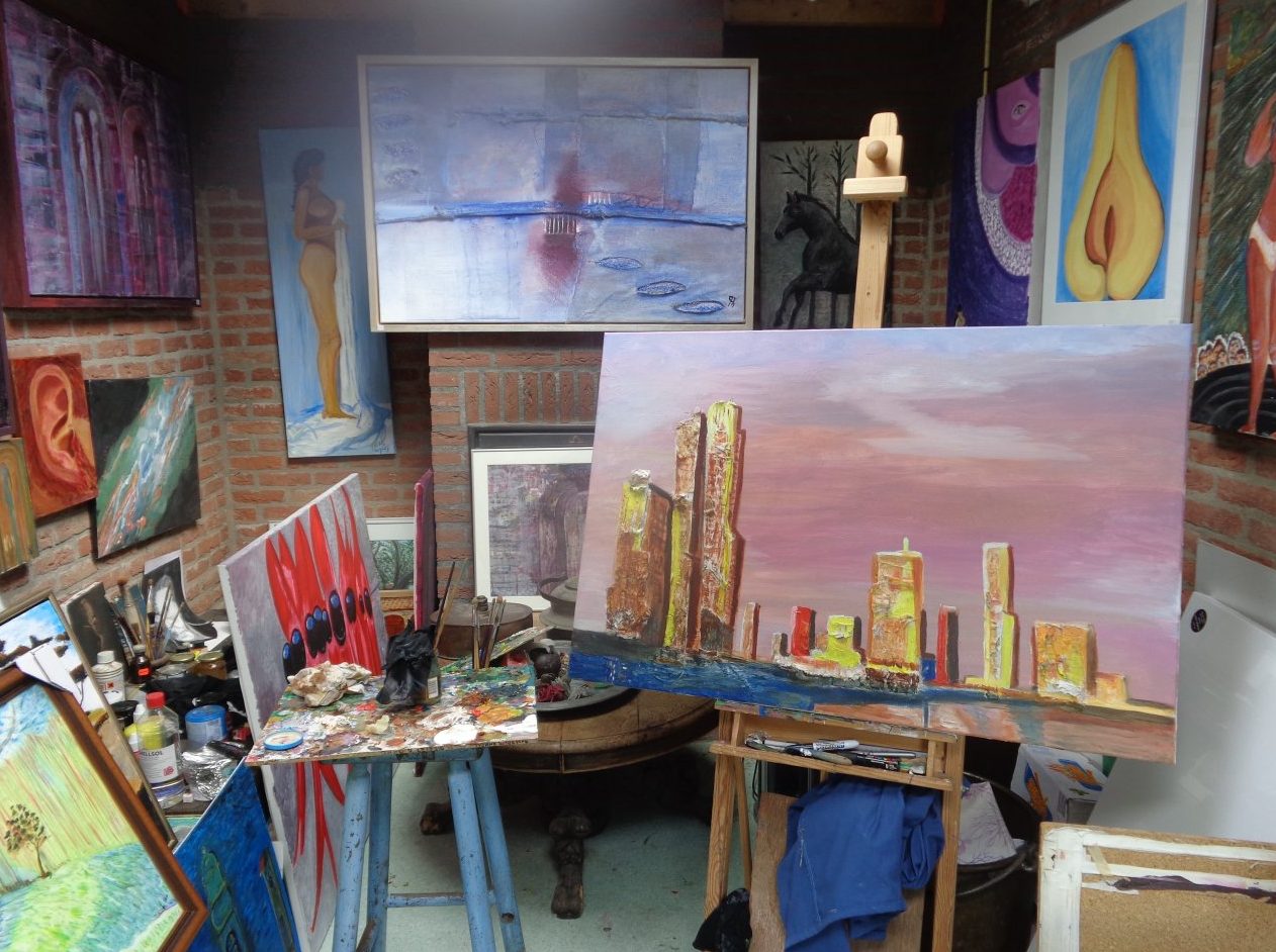 De skyline staat momenteel in mijn atelier op de Eijkmanstraat 6 in Helmond staat nu in het kunstboek Oase en doet mee met de wedstrijd schilderij van het jaar 2015 olieverf op doek afmeting 120x70 prijs 3000 euro