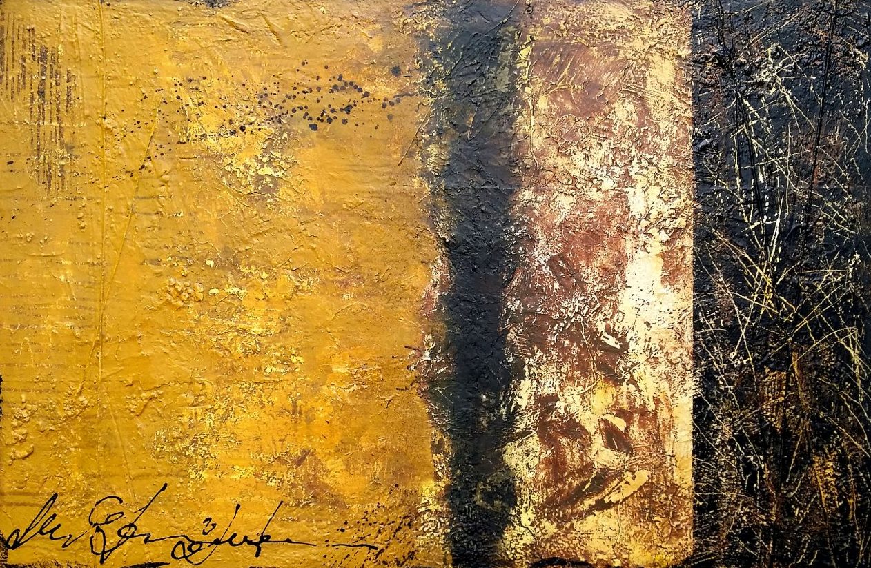 Een acryl schilderij op doek in okergele en zwarte vlakken.