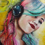 Een globale impressie van het schilderij "Music is like Meditation" 200x100cm.