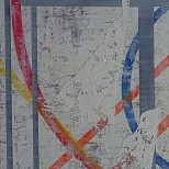 Abstract schilderij geïnspireerd op het lijnenspel in gymzalen en sportvelden. Uitgevoerd in Olieverf en inkt op linnen. Ingelijst (stalen baklijst) en gesigneerd.