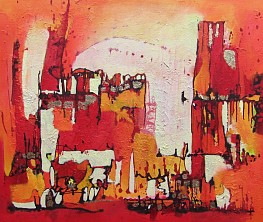 Een globale impressie van het schilderij "Red Village" 120x100cm.