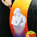 Ontwerp voor een tattoo over de hele rechterarm. Kleurpotlood op tekenkarton en ingelijst in een aluminium lijst met kwartsglas.