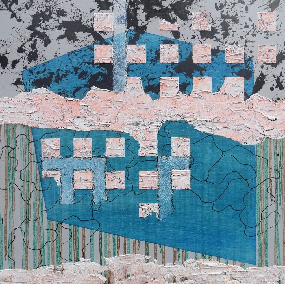 Een globale impressie van het schilderij "IRREGULAR PENTAGON nr. 2" 40x40cm.