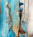 Mixed media op canvas doek (niet gespannen). Hangt mooi in houten latten met magneet aan boven- en onderzijde. Gelaagd werk met mooie blauwtinten.