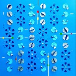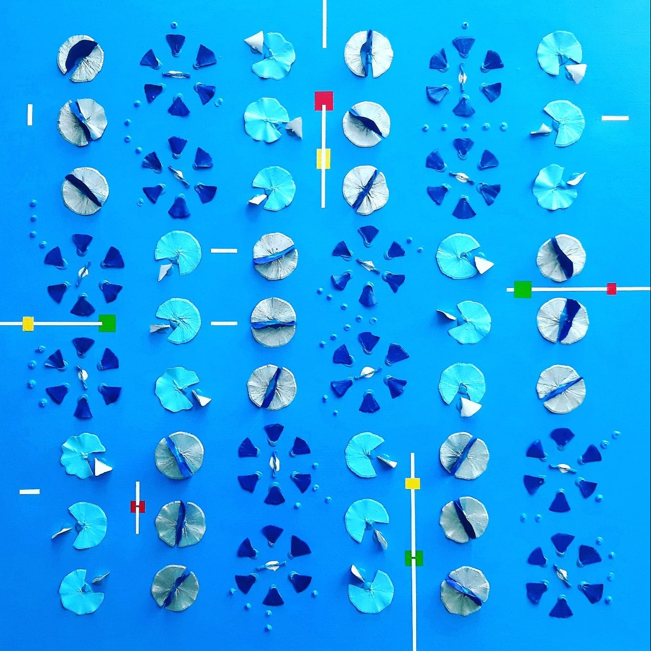 Een globale impressie van het schilderij "Flaky Art Blues" 70x70cm.