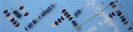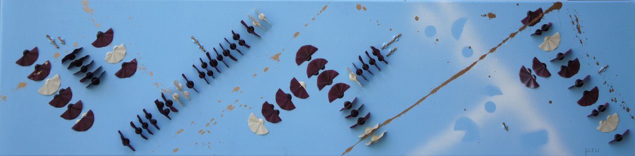 Nr 5 in een serie heldere landscape werken, met grafitti accenten. 3D. Hemp rope, acryl, wood flakes and varnish. Geometric, abstract, art, constructivism. 120x30x8cm. Voor meerdere werken uit deze serie, zie mijn website www.pleu.nl