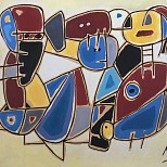 Werk in de stijl van de latere serie van Karel Appel van de circus figuren. Het werk wat op acrylbasis is gemaakt is onder het pseudoniem Moos ( Martin Oosterwijk) gesigneerd. Het werkstuk is bovendien (al) voorzien van een zwarte lijst afgewerkt met zilveren bies.