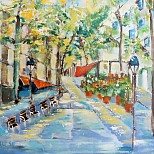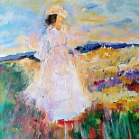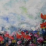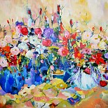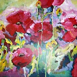 Een globale impressie van het schilderij "Stokrozen" 40x120cm.