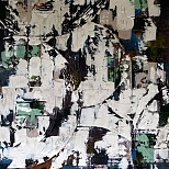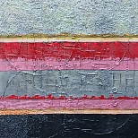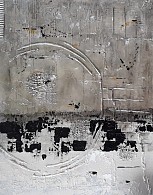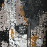 Rustig werk met aparte kleuren, nl. zilverkleur met zwart en beige, met heel kleine stipjes okergeel