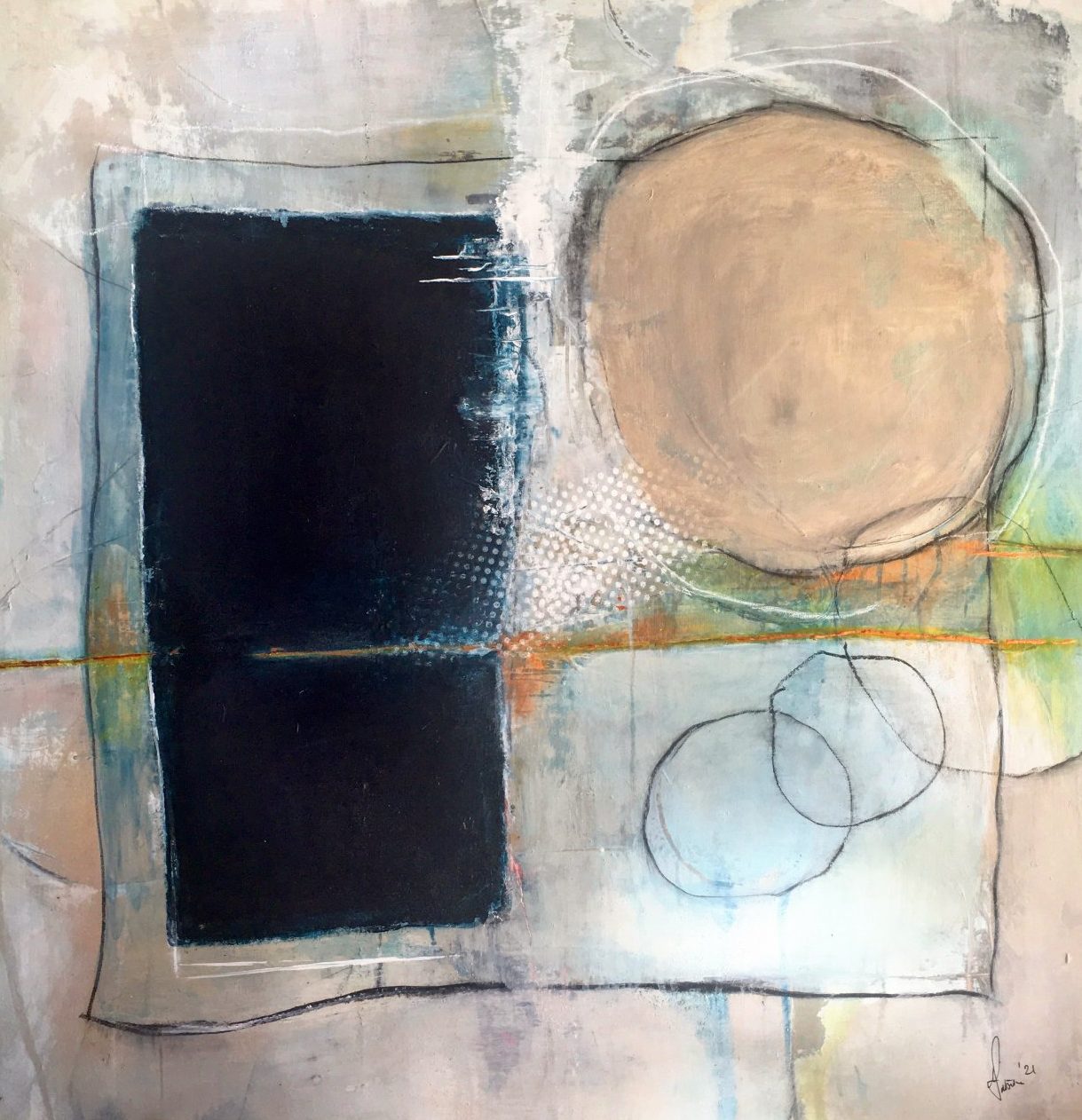 Een globale impressie van het schilderij "Out of the box" 90x90cm.