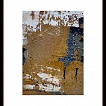 Een rustig, maar rijk gedecoreerd doek, onderkleur beige met bruin en daarover heen twee kleuren geel, onderbroken door strepen