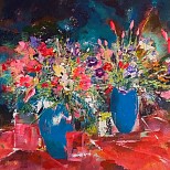 Een globale impressie van het schilderij "Klaprozen" 100x100cm.