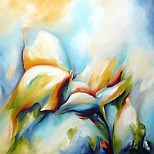 Een globale impressie van het schilderij "Red adventure" 100x100cm.