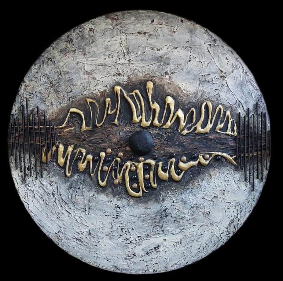 Een mixmedia met structuurpasta,hout, alufoli en acrylverf