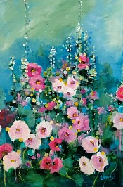 Een globale impressie van het schilderij "Stokrozen" 80x140cm.