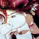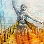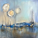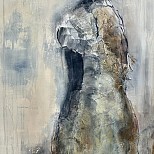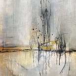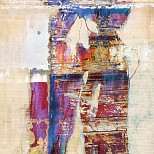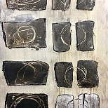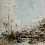 Mixed media schilderij met veel textuur van craquelé en roest, natuurlijke pigmenten.
