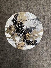 Sky explosion 9. Mixed media . Acryl ,bladgoud en glasparels op rond canvas doek. Afgewerkt met vernis ,incl. Ophangsysteem.