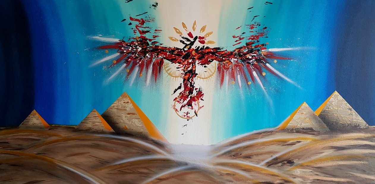 Een globale impressie van het schilderij "Descent of the Annunaki" 120x60cm.